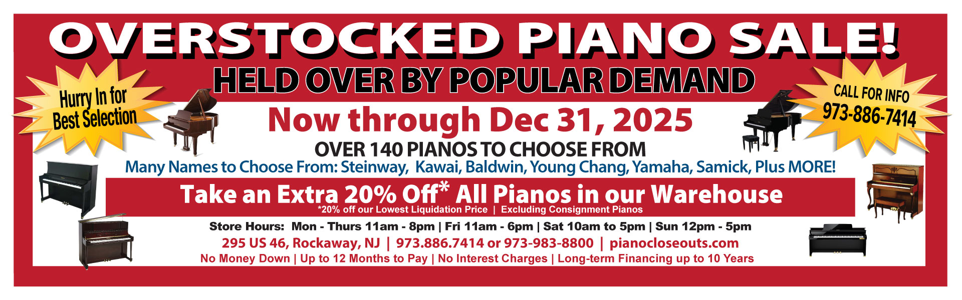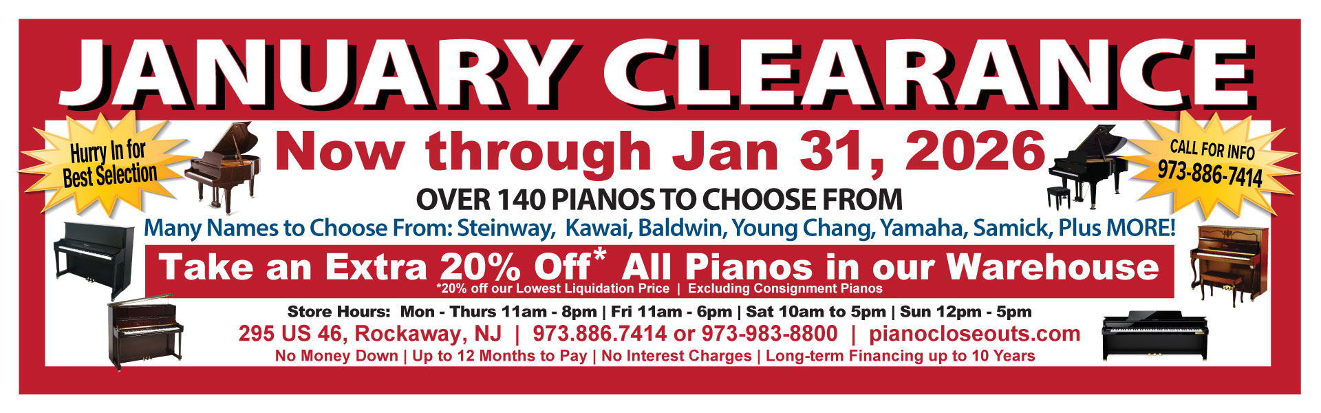 Visit our Rockaway, NJ piano showroom 7 days a week for the best pianos by famous makers like Baldwin, Yamaha, Steinway, Kawai, Schulze-Pollmann, Hallet Davis & Co. Boston, Charles Walter, Young Chang, and many others.