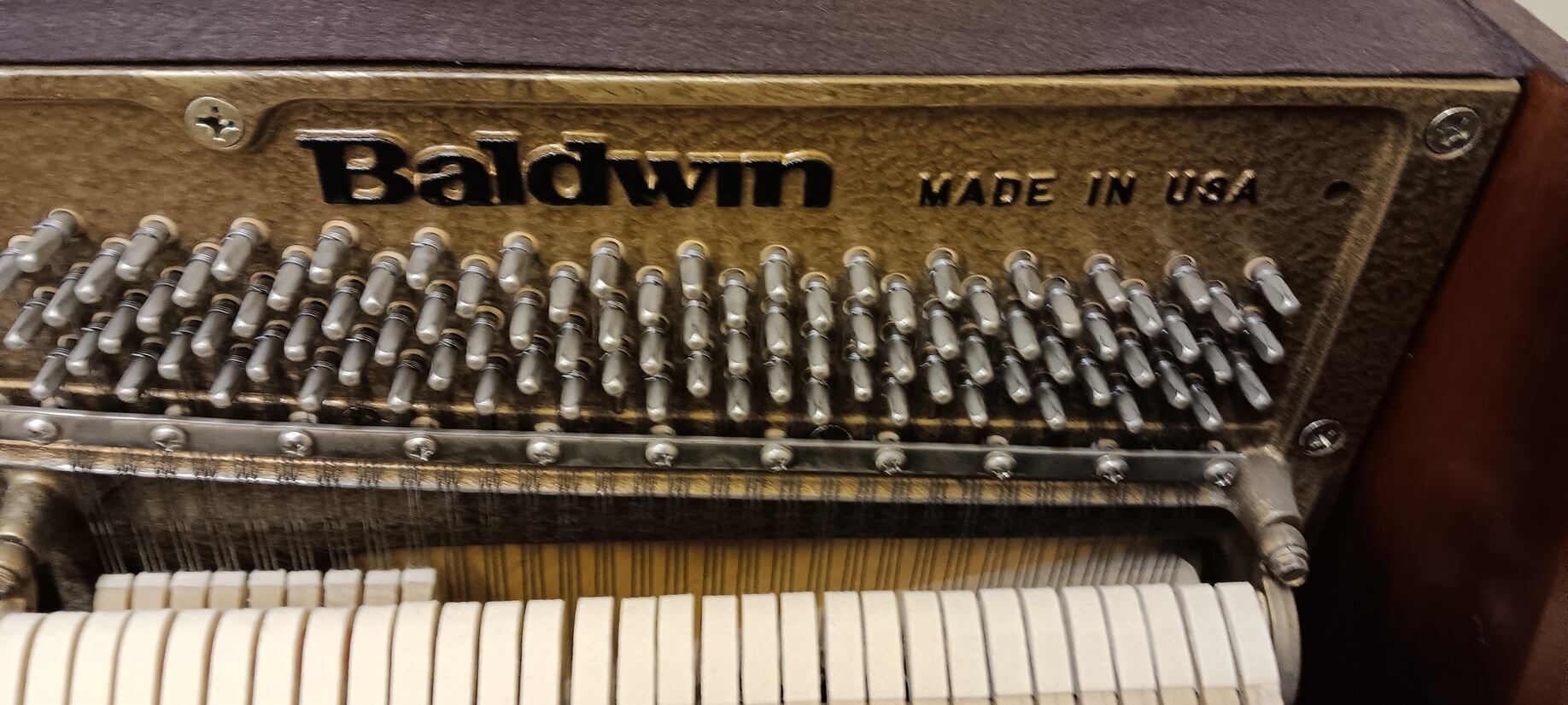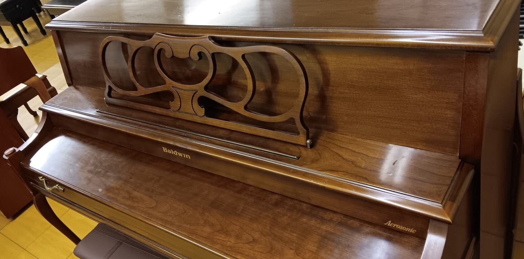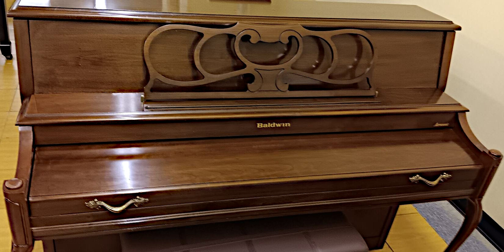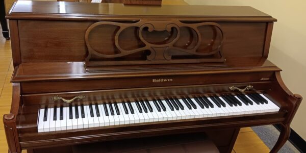 The Baldwin 2076 model is a USA-made Baldwin and features a lovely cherry-wood French Provincial style cabinet. The cabinet features a grand-style lid prop, graceful legs, and an elegant music rack – all making for a perfect addition to your home. This Baldwin is a top-of-the-line model with a solid spruce soundboard, full-blow action for responsive key movement and a 19-ply hard rock maple pin-block for reliable tuning stability. This instrument has been inspected, detailed and tuned by our professional staff and it is in excellent condition. It comes complete with a matching bench and a 2 year guarantee on parts and labor.