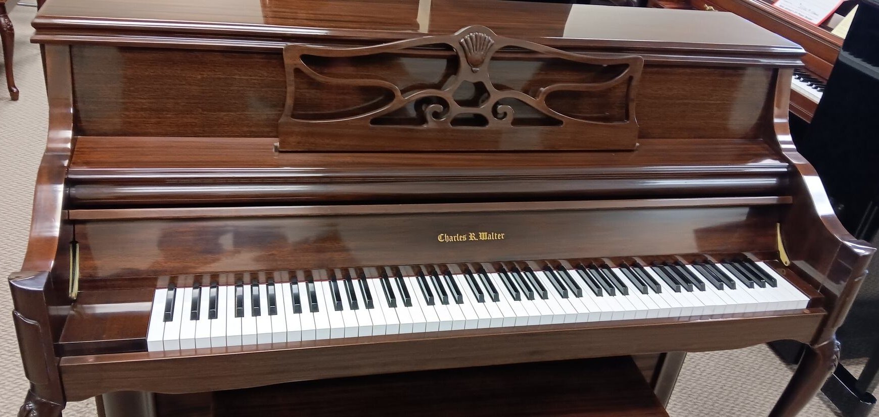 Hand crafted in the USA by the Charles Walter piano company of Elkhardt, Indiana. The company produced less than 700 pianos per year, in the master craftsman style. This instrument was signed by Kevin Walter with his final approval. Walter pianos have longer string length and larger soundboard size than much taller pianos like the Kawai and Yamaha Professional upright series. The furniture of Charles Walter pianos are made of all solid core lumber, not plywood or particle board found in Asian counterparts. These pianos also feature longer key length and hand balanced and weighted action, for the most uniform and expressive feel available in vertical pianos. Simply put, when it comes to vertical pianos, Charles Walter is world class and the best of the best! This piano comes in Queen Anne styling with Mahogany Polish finish. The piano is certified preowned and comes with a matching bench and an 8 year guarantee parts and labor.